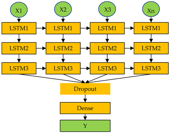 Previous studies have shown that Deep-LSTM has stronger stability and higher accuracy than conventional LSTM [22,23]. Deep-LSTM can be considered as multiple LSTM network neurons stacked together to form a training unit, with the time series information output of the previous layer used as the time series information input of the next layer (Figure 4). The depth of the structure can build a hierarchical feature representation of the input data, thereby improving the efficiency of model training. Since the time series of Deep-LSTM is very complex, the number of training iterations is large, and problems of overfitting and data redundancy are prone to occur. Therefore, the dropout function is added to the network framework, and a certain amount of loss can proportionally occur during each iteration of training. The output of the LSTM structure at the current moment is passed into a fully connected dense layer to obtain the final output.