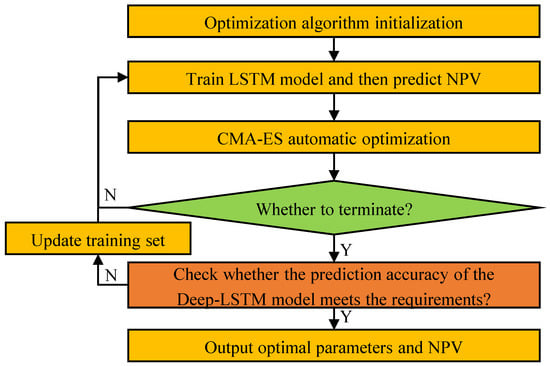On the basis of the construction of the Deep-LSTM proxy model, we further combined the covariance matrix adaptive evolutionary algorithm (CMA-ES) with the Deep-LSTM model to optimize the injection and production parameters of hydrocarbon gas flooding in the Baoshaceng reservoir. The CMA-ES is a stochastic non-gradient algorithm that has strong global optimization ability [31,32]. The specific optimization process is shown in Figure 5 and is presented briefly as follows: