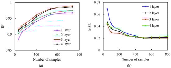 Figure 6 shows the model accuracy’s dependence (in terms of the determination coefficient R2) on the number of samples at varying numbers of layers. It can be seen that for a given number of layers, the model accuracy shows a gradually increasing trend with the increase in the number of samples. However, when the number of samples is larger than approximately 800, increasing the number of samples results in a very limited elevation in the model accuracy. It can be also seen from Figure 6 that the number of layers exerts a profound effect on the model accuracy. For example, for a given number of samples of 800, the R2 values of the single-, two-, three- and four-layer Deep-LSTM network are 0.967, 0.975, 0.989 and 0.986, respectively. By comparison, it can be found that the three-layer Deep-LSTM model has higher accuracy and stability than models with single, two and four layers. In this regard, the three-layer Deep-LSTM architecture was selected in this study.
