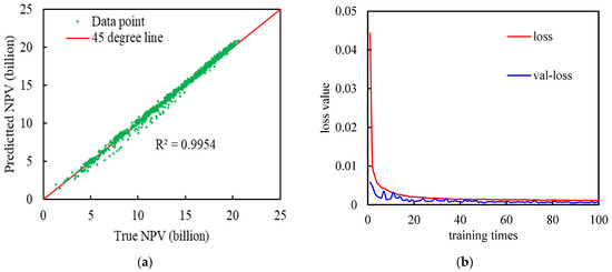 Comparison of (a)The cross plot of predicted versus true NPV based on the Deep-LSTM model (test set training effect) and (b) Loss function value changes during training.