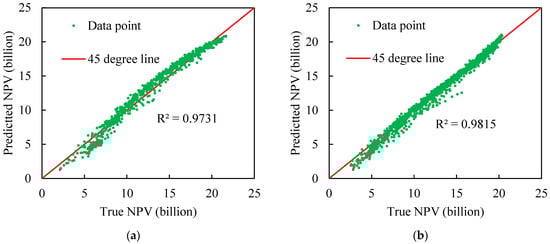 With the aim of optimizing the Deep-LSTM architecture, the values of the hyperparameters were further optimized. The results showed that the optimal time step, single batch output, number of neurons in a single layer, dropout loss value and training round were 3, 32, 24, 48, 60, 0.2 and 100, respectively. Figure 7 depicts the scatter plot of predicted versus true NPVs with the optimized Deep-LSTM. It can be seen that the data points are located around the 45-degree line. The corresponding R2 and MSE are 0.9954 and 0.018, respectively, indicating the relatively high accuracy of the model.