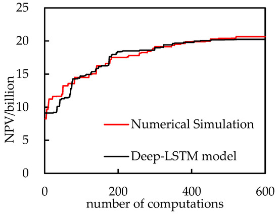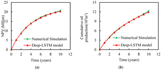 Table 10 compares optimization results based on the Deep-LSTM and conventional numerical simulation. It can be seen from the table that compared with the optimization results based on numerical simulation, the prediction error of NPV is 2.1%, and the prediction error of cumulative oil production is 3.5%. However, the optimization efficiency of the Deep-LSTM model was improved by more than 90%. In summary, the optimization method based on the Deep-LSTM model established in this paper significantly improved optimization efficiency while ensuring optimization accuracy, which proves the effectiveness and superiority of the optimization method based on the Deep-LSTM model. At the same time, the Deep-LSTM model we established in the optimization process has the characteristics of repeatable optimization.