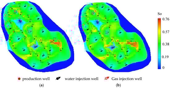 Comparison of oil saturation after well control optimization using (a) conventional numerical simulation and (b) the Deep-LSTM proxy model.