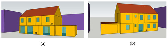 Views of the main facades with indication of the thermal zones considered (Z1: living room, Z7: main bedroom). (a) Rear façade (east oriented). (b) Front façade (west oriented).