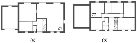 Following an initial measurement of its main characteristics, the performance of the house has been monitored during one full year (2016), including: air temperatures, electricity use (internal gains), heating demands, airflows induced by mechanical ventilation, efficiency of the heat recovery system, U values of the walls and airtightness. Some weather data have also been monitored on site (dry bulb temperature and relative humidity) and complemented by data from the Royal Meteorological Institute of Belgium (RMI) (radiation, cloud cover, etc.). The characteristics of the house presented in Table 1 derive, thus, from on-site verifications, interviews with the occupants (e.g., about windows opening behaviours) and calculations from the Walloon EPBD (Energy Performance of Buildings) tool []. In the framework of this study, two main rooms were analysed: the living room (Z1) and the main bedroom (Z7). A description of their spatial characteristics is included in Table 1 and illustrated in Figure 1 and Figure 2.