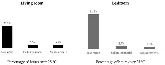 Figure 4 illustrates the capability of the calibrated model to estimate the time exceeding 25 °C in the living room and in the main bedroom compared to the values that were measured in 2016. The year 2016 can be considered broadly in line with the average of the last 30 years, both in terms of solar radiation and of temperatures [] (for an overview of climatic historical data, see Figure 5).