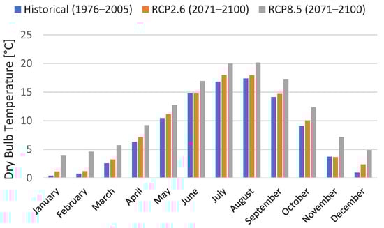 Monthly mean dry bulb temperature evolution under historical, RCP2.6 (2071–2100) and RCP8.5 (2071–2011) scenarios according to ALARO Model [].