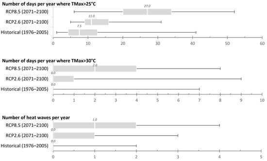 As mentioned in the introduction, there is wide consensus that these scenarios will impact the frequency and the duration of heat waves []. In Belgium, heatwaves are defined as a period of minimum 5 consecutive days with air temperature reaching at least 25 °C and more than 30 °C for at least 3 days []. Figure 6 presents the evolution of the number of heat waves per year as well as the number of days reaching 25 °C and 30 °C according to RCP 2.6 and 8.5 for the end of the century (2071–2100) compared to the historical period (1976–2005) for Uccle. A standard boxplot representation has been used to illustrate the distribution (min, 25th percentile, median, 75th percentile, max) of the encountered values for the considered period. Median values have also been specified to increase the readability of these graphs. These sets of data, covering a period of 30 years each, were directly introduced in the TRNsys simulation software with an hourly resolution (using an IWEC format []) in order to provide a detailed overview of their implications on the building indoor climate.