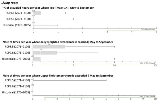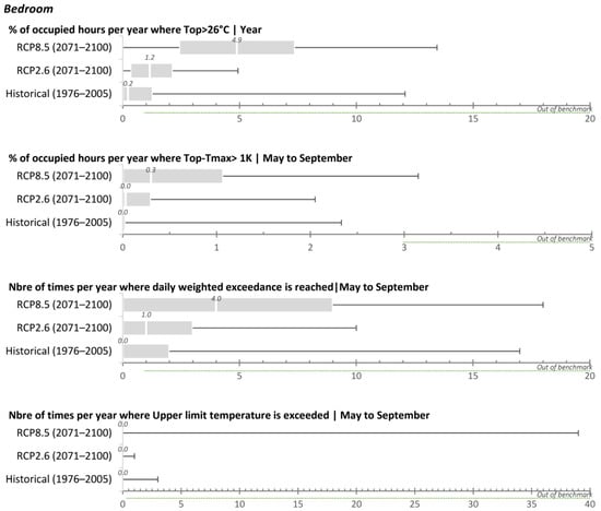 For the living room, Figure 7 shows that the Adaptive hours of exceedance criteria (not more than 3% of occupied hours where Top − Tmax > 1 K) is met under the three climatic scenarios. The Daily weighted exceedance criterion is met for 75% of years between 1976 and 2005, but this result could drop under 50% of the years between 2071–2100 (38% under RCP8.5 scenario). Moreover, this criterion is not met for more than 2 days per year for half of the years between 2071 and 2100 under the RCP8.5, while it is only exceeded once per year in 25% of the years between 1976 and 2005. The Upper limit temperature criteria is only exceeded under the RCP8.5 scenario (three times and up to 6 K). For the main bedroom, Figure 8 shows that the Static hours of exceedance criterion (max 1% of occupied hours per year where Top > 26 °C) is only exceeded 25% of the years during the historical period. The non-compliance with this criterion could, however, become systematic: 25 years are exceeding this criterion over the period 2071–2100 under the RCP8.5 scenario. On the contrary, the Adaptive hours of exceedance criterion (not more than 3% of occupied hours where Top − Tmax > 1 K) is exceeded only one year out of four under this scenario (while it is met under the other scenarios). The median value of the number of days exceeding the Daily weighted exceedance reaches 4 between 2071–2100 (under RCP8.5 scenario), while it is 0 for the historical period. The Upper limit temperature criterion is not frequently exceeded but it reaches higher frequencies per year under the RCP8.5 scenario (up to 39 times per year).