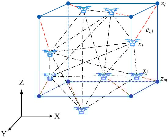 Consider a UAV swarm consisting of N UAVs, let denote the coordinate matrix of the initial topology, where is the 3D coordinate vector of the ith UAV in the initial topology. The coordinate matrix of the target topology is denoted by , where is the 3D coordinate vector of the lth target position derived by the target topology shape.