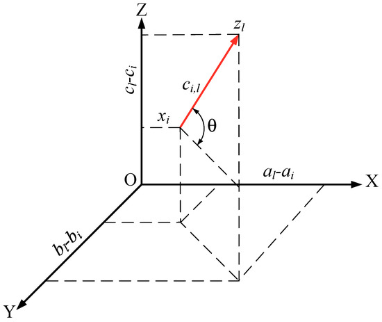 According to [16,25,28,29], the traditional energy consumption from node i to position in the topology forming process is assumed to be only related to the squared Euclidean distance between and . The coordinate origin and standard direction of the target coordinate system are assumed to be overlapped with the initial coordinate system, thus