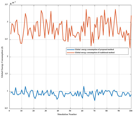 In the case of cube-shaped target topology, 100 sets of simulations were conducted to compare the global energy consumption between the traditional topology shaping method and the proposed topology shaping method, as shown in Figure 4. In each simulation, the initial topology nodes’ coordinates are randomly generated while the target topology coordinates are fixed. The cost matrix of the proposed method is derived by Equation (3) based on Table 2. The cost matrix of the traditional method is derived by Equation (1). The global energy consumption of the traditional method is derived based on the mapping relationship from traditional method and the cost matrix of the proposed method. Simulation results show that the global energy consumption of the proposed method is far below the traditional energy consumption model.