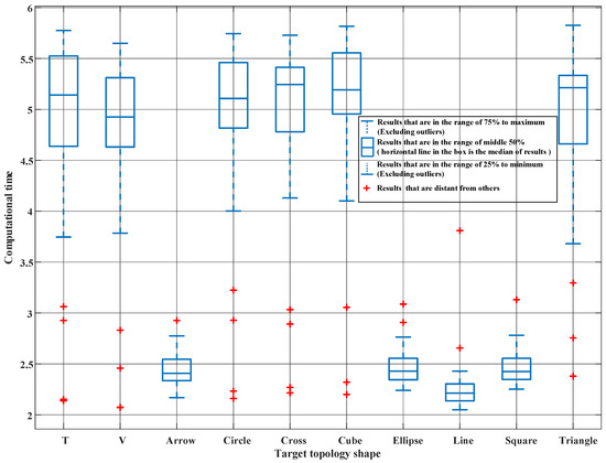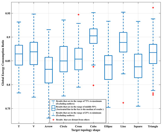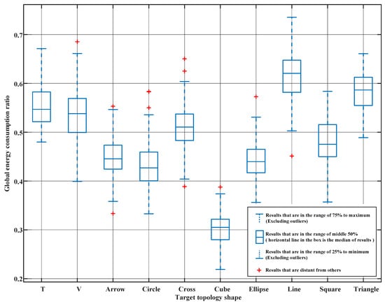 To compare the energy consumption of the proposed method and the traditional method more sufficiently, 100 simulations were performed for each of the 10 target topologies. The global energy consumption ratios of the proposed and traditional methods were recorded. A box plot of the global energy consumption ratio has been created by Matlab’s function, as shown in Figure 5. The red dots, which are plotted as individual points in Figure 5, are the results that are distant from other simulation results. Simulation results show that the average ratio of the global energy consumption of the proposed method to the traditional method is at in the case of cube-shaped target topology, while average ratios of the other nine topology shapes are in the range of to . The energy consumption ratio is different because the cube is a true 3D topology, while the other topologies are distributed on a certain plane. Simulation results show that, compared with the proposed method, the mapping relationship derived from the traditional method is non-optimal.
