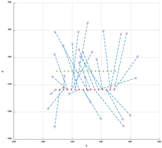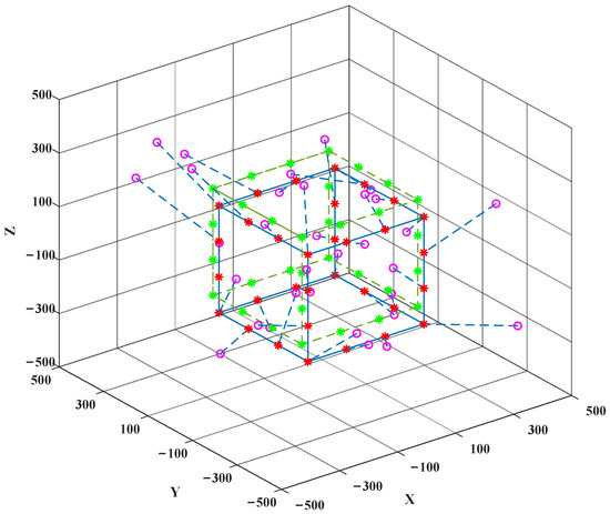 An intuitive simulation of the impact of the translation vector on the topology shaping position is shown in Figure 6 based on the cube-shaped target topology. The purple circles represent the initial positions of nodes. The dashed green line is the outline of the initial position of the target topology without translation. The red asterisks represent the target positions after translation. The solid blue line outlines the optimal topology shape, which is translated by based on the initial target topology. The dashed blue line is the mapping relationship from the initial positions of UAVs to the translated target locations of the target topology shape.