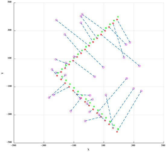 In the first case, the topology is shaped based on the common assumption that the origin of the target topology shape coincides with the geometric center (GM) of the initial UAV swarm topology shape, i.e., is overlapped with . The target topology is shaped by blue dots (). The global energy consumption in topology shaping process is denoted by , which is the sum of the squared distances from the initial positions to target positions, as indicated by red dashed lines in Figure 3, i.e., .