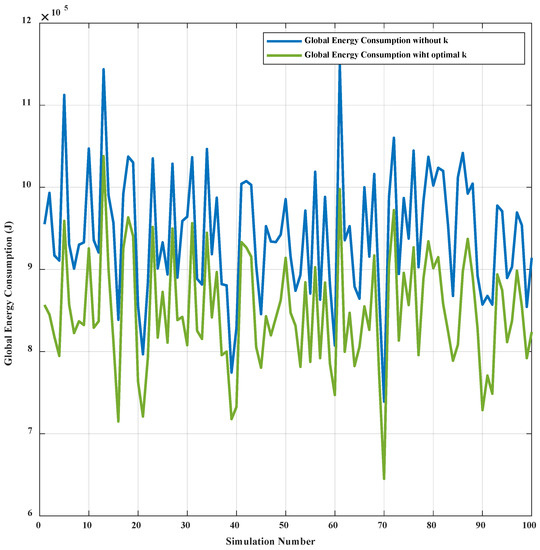 In this section, to verify the impact on global energy consumption of translation vector , 100 simulations were conducted for the cube-shaped topology based on the proposed method. Simulation results show that the global energy consumption of the topology shaping after translation of vector is lower than that without translation as shown in Figure 9.