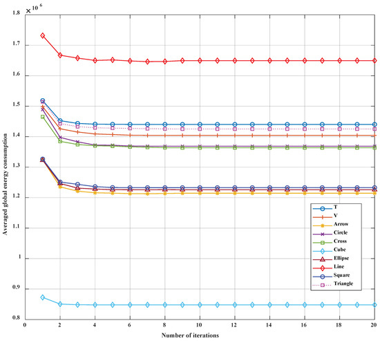 Newton’s method has been employed to derive the translation vector. The convergence of Newton’s method is analyzed in this section. Figure 11 is obtained by an average of 100 sets of simulations in the ten typical target topologies. Simulation results show that the averaged global energy consumption tends to be stable after 8 iterations.