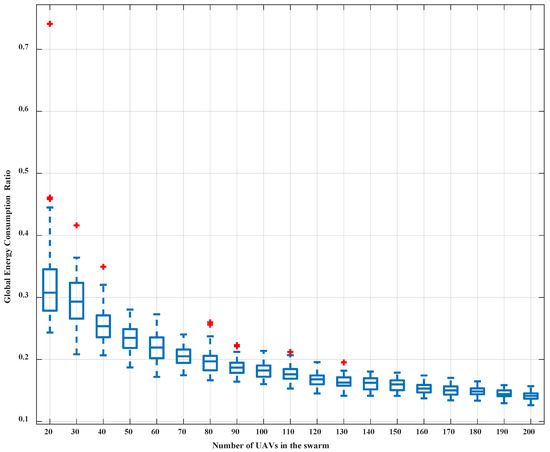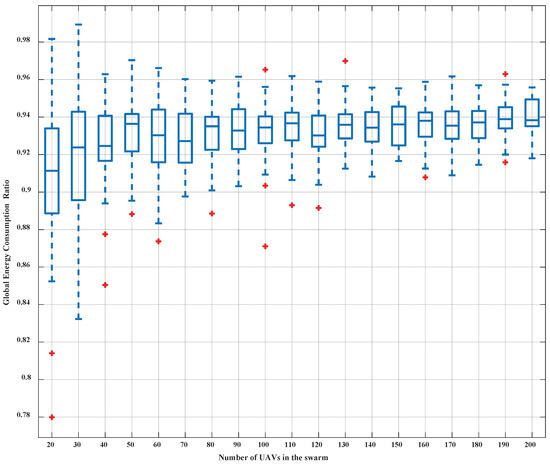 To verify the impact of the number of UAVs on the performance of the system in our proposed and traditional methods, a series of simulations have been conducted in which the number of UAVs in the swarm increases from 20 to 200. In the simulations, both the initial topology and the target topology are randomly distributed in 3D × × space. Fifty independent simulations have been performed for each UAV swarm. Figure 13 is a box plot of the simulation results of the global energy consumption ratio using our proposed and traditional energy consumption models. Simulation results show that the average global energy consumption ratio is below and decreases gradually as the number of UAVs increases. Figure 14 is a box plot of the simulation results of the energy consumption ratio with and without the translation vector . Simulation results show that the global energy consumption is reduced by on average after the introduction of the translation vector in swarms with different numbers of UAVs.