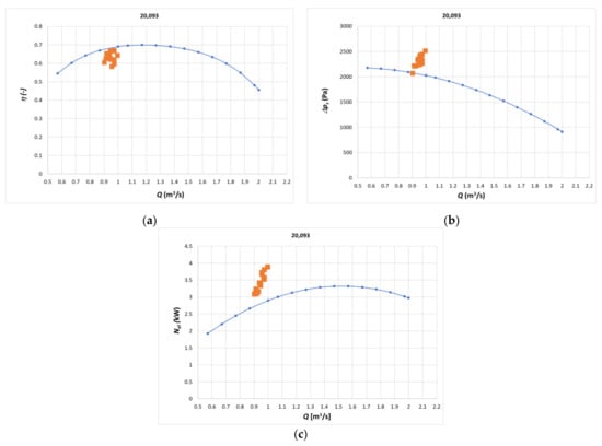 The calculated and analysed data is compared to the current operating points against the characteristics of the respective fan types. This was followed by continuous measurements, ongoing analysis of the collected data, and selection of data for use in the process of modelling and model verification. Several measurement points collected between June and November 2021 determined using the above calculation methodology are presented below against the background of the characteristics of an exemplary 20,093 fan (