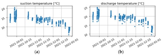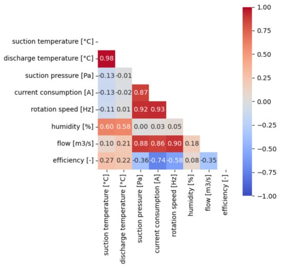 Figure 5), and a very strong correlation was observed between the temperature of the mixture in the suction duct and the temperature of the mixture in the discharge duct (r = 0.98). In addition, flow velocity is highly correlated with current consumption (r = 0.86), fan rotational speed (r = 0.90), and suction duct pressure (r = 0.88). Such high correlations suggest that these four parameters can be replaced by one/two parameters in a mathematical model without any apparent decrease in model accuracy.