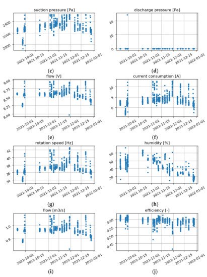 Figure 3 shows examples of measurement points from selected days used for data analysis. The collected measurement data made it possible to select sets to train and verify the model predicting the process of changes in characteristics of the fan and the system in time and to assess the significance of the influence of various design parameters of the fan and the system. The data collected allowed verification of the models built and clarification of the variables required to assess the relevance of those models during long-term operation.