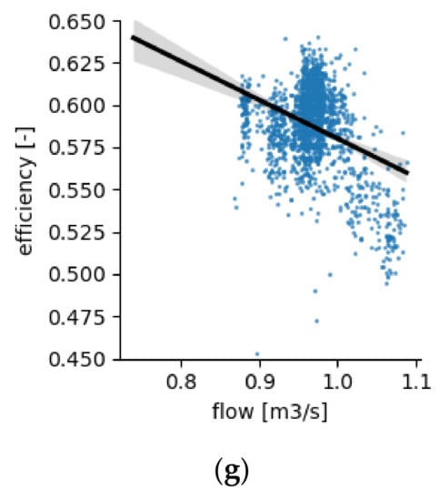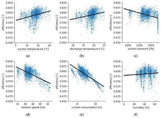 p < 0.001). However, for humidity and gas temperatures in the suction and discharge ducts, the correlations are very weak: r = 0.077, 0.272 and 0.220, respectively (all below 0.30). Correlations are also noticeable in the graphs of parameter—efficiency (