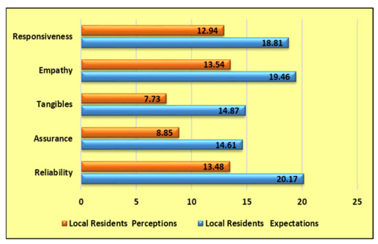 Figure 5 shows local residents’ highest expectations with the reliability of IoT towards energy management solutions (20.17), followed by empathy (19.46), responsiveness (18.81), tangibles (14.87), and assurance (14.61), and similarly, highest perceptions with empathy (13.54), reliability (13.48), responsiveness (12.94), assurance (08.85) and tangibles (07.73). Furthermore, because of overall residents’ expectations and perceptions, the most satisfied with IoT as a reliable source for sustainable energy management at tourism destinations is with assurance, because the difference between their expectations and perceptions is as low as 0.579%, followed by responsiveness (05.87), empathy (05.92), reliability (0.6.69) and tangibles (07.14).