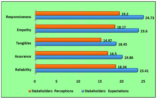 Figure 6 shows stakeholders had the highest expectations for the responsiveness of IoT about energy management solutions (24.20), followed by empathy (23.60), reliability (23.41), assurance (19.86), and tangibles (18.45), and similarly highest perceptions for assurance (19.86), responsiveness (19.20), reliability (18.34), empathy (18.17) and tangibles (04.97). Furthermore, because of overall tourism stakeholders’ expectations and perceptions, they are most satisfied with IoT as a trustworthy (assurance) source for sustainable energy management at tourism destinations. As with assurance, the difference between their expectations and perceptions is the minimum (3.36), followed by tangibles (3.48), reliability (05.07), empathy (0.5.43), and responsiveness (07.56).