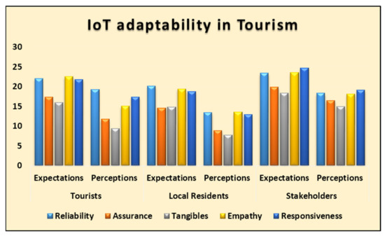 To examine the awareness and acceptance of the Internet of Things (IoT) by tourism destinations, which majorly constitute the tourism system, about planning and management of sustainable energy (energy and natural resources at destinations meeting the needs of future generations even without compromising present needs, wants, and desires of tourism personnel), expectations and perception of tourists, residents, and stakeholders were measured critically and empirically. Tourists, residents, and tourism stakeholders are the moral and legal stakeholders in the tourism sector who determine and conduct the entire tourism system at all levels, and tourism cannot develop with their active participation. Therefore, expectations and perceptions of tourists [111], residents [112], and stakeholders [113] are very crucial to investigating any new concept, trend, or innovation in tourism, before and after their applications. The same has been examined in this particular study regarding the IoT and its technologies [114].