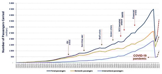 Though the consensus regarding the need for both short- and long-term reduction in the carbon footprint remains unchanged [10], most of these plans and schemes were conceived based on models that predicted a continuous growth in commercial air traffic [11], and did not account for the abrupt halt in flights caused by the ongoing COVID-19 pandemic, which brought the biggest drop in global air passengers in history, as Figure 1 shows.