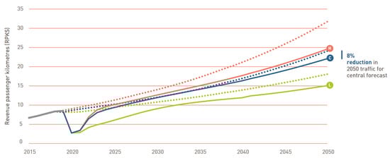 Air Transport Action Group’s pre- (dotted) and post-Covid (solid) predictions for revenue passenger kilometers until 2050, for high (H in red), central (C in blue), and low (L in green) traffic forecasts. Adapted from [17].