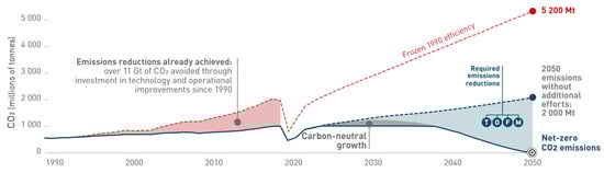There are several different areas of focus allowing to reduce the industry’s GHG output, but each have different current levels of potential. Optimizing flight routes for minimum emissions rather than cost, improving maintenance schedules and other operational measures, as well as introducing further advancements in weight reduction materials and related technologies [2,20], bring important contributions to decrease emissions and should not be neglected, but are clearly insufficient. Gains in fuel efficiency amount to the most significant improvement in recent decades, with the current generation of aircraft being 20% more efficient than the previous generation, and 85% more than those of the 1960s [2]. However, the rate of improvement is progressively slowing down [21], and future progress is not expected to match the projected increase in air traffic, hence will therefore be insufficient, as Figure 3 indicates. Research has also been conducted in enabling a reduction in emissions in specific stages. Naturally, flight emissions are higher at take-off and climb stages [22], but engine start-up and warm-up emissions are also of particular importance, as the inefficiency associated with cold-starts [23] originates high emissions and energy losses. Furthermore, the GHG reduction since the beginning of the pandemic also empowered movements which contend that the best course of action would be to prevent further growth in the industry, rather than put all hope on future scientific breakthroughs [24]. Nevertheless, given the competitive nature of the market, this option appears to be unfeasible. It is therefore clear that, in order to accomplish the required results, it becomes necessary to lower and eventually end the dependency of commercial aviation on fossil fuels.