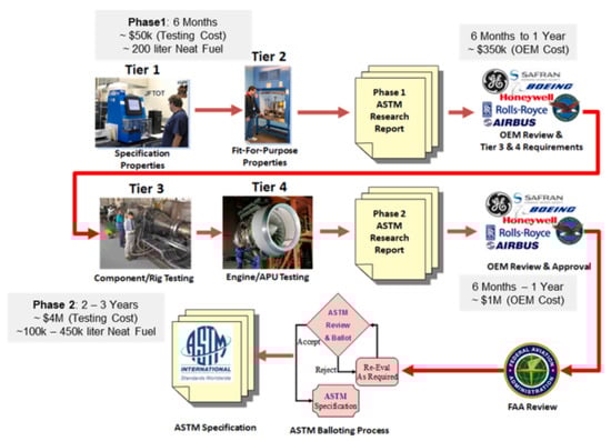 The process for a new aviation fuel to become certified for commercial usage is a complex and rigorous one, and is defined by ASTM D4054, Standard Practice for Qualification and Approval of New Aviation Turbine Fuels and Fuel Additives, a three-phase, four-tiered testing process [36], represented in Figure 4. Once an SAF completes all the required testing procedures successfully, it is then added to ASTM D7566, Standard Specification for Aviation Turbine Fuel Containing Synthesized Hydrocarbons, that regulates drop-in fuel specifications, and can be used in commercial aviation up to the approved blending ratio.