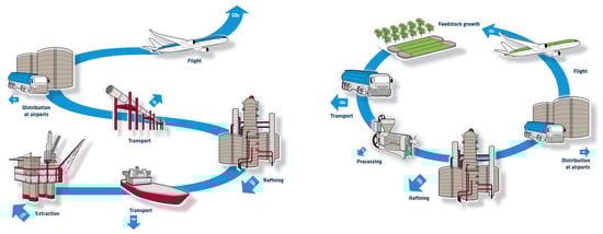 Carbon life cycle diagram for fossil jet fuel (left) and sustainable biofuel (right). Adapted from [40].