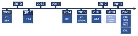 Figure 6 shows a timeline of approval for the mentioned pathways, and in Figure 7, the feedstock to fuel process for each ASTM D7566 certified fuel is presented.