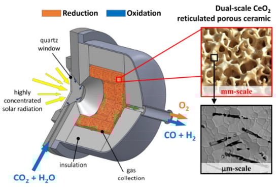 - Koepf, E.; Zoller, S.; Luque, S.; Thelen, M.; Brendelberger, S.; González-Aguilar, J.; Romero, M.; Steinfeld, A. Liquid fuels from concentrated sunlight: An overview on development and integration of a 50 kW solar thermochemical reactor and high concentration solar field for the SUN-to-LIQUID project. AIP Conf. Proc. 2019, 2126, 180012. [Google Scholar]