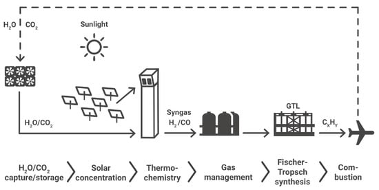 - Schäppi, R.; Rutz, D.; Dähler, F.; Muroyama, A.; Haueter, P.; Lilliestam, J.; Patt, A.; Furler, P.; Steinfeld, A. Drop-in fuels from sunlight and air. Nature 2022, 601, 63–68. [Google Scholar] [CrossRef] [PubMed]