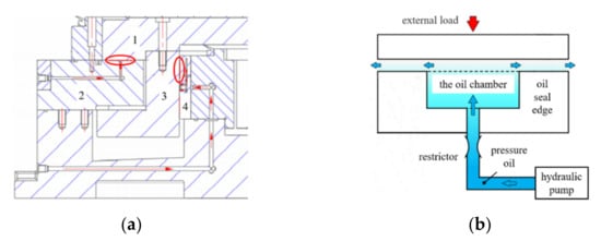 Hydrostatic bearings, with the characteristics of high load-carrying properties, steady operation and low friction resistance, are widely used in heavy-duty high-precision equipment, and have become the core component of ultra-precision computer numerical control (CNC) machine tools [1,2,3,4]. The hydrostatic bearing in a hydrostatic turntable is shown in Figure 1. The hydrostatic bearing sends the hydraulic oil with a certain pressure to the oil chamber of the bearing to form a pressure oil film by using an oil supply device. Then, the pressure difference between the oil chambers forms the bearing capacity for floating the main shaft and supporting the external load, as shown in Figure 1b [3]. However, during the operation of the hydrostatic turntable, the velocity difference between the moving upper guide rail and the stationary axial bearing (or the moving lower guide rail and the stationary radial bearing) will be transmitted to the oil film. The viscous shear force, due to the existence of the velocity difference, converts mechanical energy into heat energy through frictional power consumption. On the one hand, the temperature of the hydraulic oil is increased, and the viscosity is correspondingly reduced, which leads to the change in the flow field state and the decline of the bearing performance [5]. On the other hand, the thermal deformation of the parts is forced to occur, in which the shape and gap of the oil film are forced to change [6]. These two aspects can affect the working accuracy of bearings.
