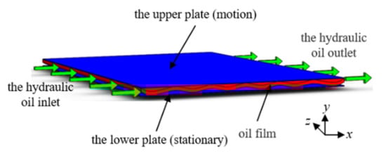 Because the velocity of the hydraulic oil is small, it is generally considered that the flow of hydraulic oil between the upper and lower plates is laminar flow [3], which means that the velocity v along the y-axis can be ignored. Meanwhile, the hydraulic oil is a steady flow, and Equations (1)–(3) can be written as: