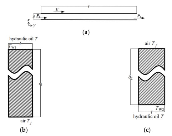 The length of the hydrostatic oil film formed between the upper guide rail and the axial bearing is 3–4 mm, and the thickness is 20 μm. VG10 hydraulic oil moves between the upper plate and the lower plate with a distance of 20 μm, enters from the left side of the plate and exits from the right side as shown in Figure 2. There is a pressure difference along the x-axis, with the pressure on the left and right being and , respectively (). There is also a velocity difference along the y-axis, and the velocity of the upper plate and the lower plate are U and 0, respectively, as shown in Figure 3a. The temperatures of hydraulic oil and air (environment) are different, so there is heat transfer between hydraulic oil and air through the lower plate, as shown in Figure 3b. The upper plate is the same as the lower plate, as shown in Figure 3c. Parameter values of hydrostatic bearing are shown in Table 1.