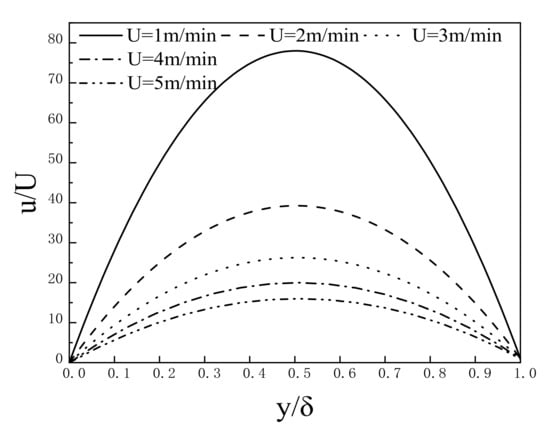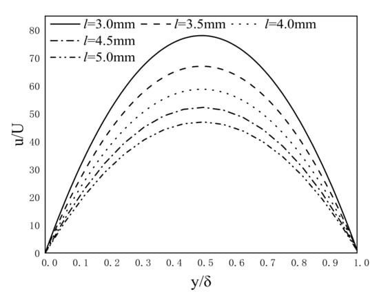 When the channel length , based on Equation (12), the effects of the upper plate velocity on oil film velocity are analyzed, as shown in Figure 4. According to Figure 4, the oil film velocity is a parabola along the channel thickness direction. With the increase in the velocity of the upper plate, the dimensionless velocity distribution curve gradually moves downward, and the peak of the oil film dimensionless velocity gradually decreases. The reason is that the effect of the upper plate velocity on the oil film velocity is larger than that of the pressure due to the increase in the upper plate velocity, so the oil film velocity is more likely to be close to the upper plate velocity.