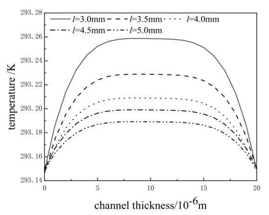 When the upper plate velocity U = 1 m/min and the inside temperature of the lower plate , based on Equations (29)–(31), the effects of the channel length on oil film temperature are analyzed, as shown in Figure 6. The oil film temperature distribution can be divided into three sections: increasing zone (the temperature increases with the increase in the channel thickness y = 0–6 μm), stabilizing zone (the temperature remains unchanged with the increase in the channel thickness y = 6–14 μm), and decreasing zone (the temperature decreases with the increase in the channel thickness y = 14–20 μm). The reasons are as follows: In the increasing zone, the temperature increases with the increase in the channel thickness due to the heat generated by friction. Then, the temperature reaches the maximum value when the channel thickness is about 6μm and enters the stabilizing zone. The heat generated by friction increases the oil film temperature, but the inside temperature of the plate decreases the oil film temperature. The two aspects are balanced in the stabilizing zone, so the oil film temperature remains stable. In the decreasing zone, the oil film temperature decreases with the increase in the channel thickness due to the effect of the lower temperature of the upper plate. The temperature distribution curve moves downward with the increase in channel length, which means that the oil film temperature decreases. The reason is that with the increase in the channel length, the contact surface between the hydraulic oil in the channel and the inside of the plate gradually increases, leading to the oil film temperature more likely to approach the inside temperature of the plate.