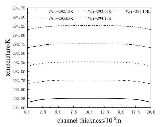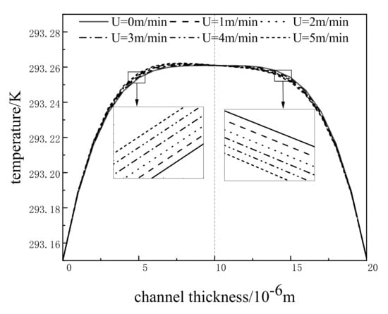 When the channel length l = 3 mm and the inside temperature of the lower plate , based on Equations (29)–(31), the effects of the upper plate velocity on oil film temperature are analyzed, as shown in Figure 7. When the channel thickness is less than 10 μm, the temperature distribution curve moves upward with the increase in the upper plate velocity, which means that the oil film temperature increases with it. When the channel thickness is greater than 10 μm, the temperature distribution curve moves downward with the increase in the upper plate velocity, which means that the oil film temperature decreases with it. When the channel thickness is equal to 10 μm, the oil film temperature is equal to 293.26 K. When the channel thickness is less than 10 μm, the velocity gradient increases with the increase in the upper plate velocity, so the heat generated by friction increases, then the oil film temperature is increased. When the channel thickness is greater than 10 μm, the velocity gradient is negative, so the heat generated by friction decreases with the increase in the velocity gradient, then the oil film temperature is decreased.
