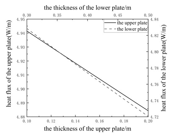 When the temperature difference , based on Equations (33) and (34), the effects of the plate thickness ( and ) on plate heat flux are analyzed, as shown in Figure 9. According to Figure 9, the heat flux decreases gradually with the increase in the plate thickness, and the relationship between the plate thickness and heat flux is linear. This phenomenon can be explained by the theory of thermal resistance. When the temperature difference is constant, the thermal resistance in the heat transfer process gradually increases with the increase in the plate thickness, so the heat flux gradually decreases. When the thickness of the upper plate increases from 0.1 m to 0.2 m, the heat flux in the upper plate decreases from 4.941 W/m to 4.884 W/m; when the thickness of the lower plate increases from 0.3 m to 0.5 m, the heat flux of the lower plate decreases from 4.828 W/m to 4.720 W/m.