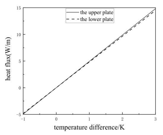 When the lower plate thickness and the upper plate thickness , based on Equations (33) and (34), the effects of the temperature difference on plate heat flux are analyzed, as shown Figure 10. The heat flux increases linearly with the increase in the temperature difference. The plate heat flux is less than zero when the temperature difference is less than zero. When the plate thickness is constant, which means that the thermal resistance is constant, the temperature difference gradually increases, then the heat transfer force gradually increases, so the plate heat flux gradually increases. Negative temperature difference means that the air temperature is greater than the inside temperature of the lower plate, then the air heat is transferred to the plate, so the plate heat flux is less than 0. When the temperature difference increases from −1 K to 3 K, the heat flux of the upper plate increases from −4.94 W/m to 14.82 W/m, and the heat flux of the lower plate increases from −4.83 W/m to 14.49 W/m.