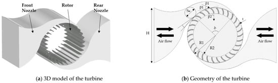 The cross-flow air turbine was designed, taking into account the reference model by Kang et al. [13]. The turbine mainly consisted of two parts: a rotor and symmetrically distributed fixed front and rear nozzle on both sides of the rotor, as shown in Figure 1. The reciprocating airflow enters the nozzle, and the concentrated flow rotates the rotor. The diameter of the turbine was 0.3 m, and the ratio of outer and inner diameter was 0.8. Nozzle entry angle, δ, was 90°, and the blade angle of attack and inlet and exit angles were α = 18°, β1 = 30°, and β2 = 90°, respectively, as shown in Table 1. To optimize turbine design, there are four design parameters: the number of blades, the thickness of blades, rotor rotational speed, and nozzle throat width. These parameters were varied under the constant-flow condition, and the performance of the turbine with optimal design parameters was investigated in bi-directional airflow.