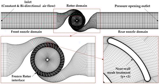 A numerical model for the cross-flow air turbine was established based on the finite volume method in the computational fluid dynamic code ANSYS CFX 18.2 to describe the integral formulation of the RANS (Reynolds-averaged Navier–Stokes) equations. The two-equation shear stress transport (SST) k–ω turbulence model was adopted to obtain satisfactory results of the turbine performance. It is worth noting that previous studies have reported that the turbulence model provides superior results to k–ε and k–ω models [32,33,34,35].