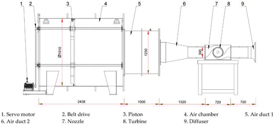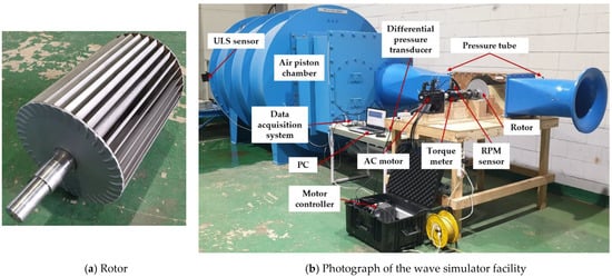 The cross-flow air turbine was investigated in the cylindric-type wave simulator facility at Korea Maritime and Ocean University (KMOU), Busan, South Korea. The detailed parameters of the turbine model are listed in Table 2, and the layout and configuration of the experimental facility are illustrated in Figure 3 and Figure 4. The wave simulator generates the sinusoidal airflow, which allows the turbine to be tested in reciprocating airflow profile. The cylindrical piston plate is driven by the servo motor through the belt drive transmission, and the stroke displacements and periods for this experiment were 0.2–1.0 m and 2.3–7.9 s, respectively. The air being pushed by the plate was delivered to the turbine through the air duct 1 and 2 and the nozzle. The AC servo motor maintained the constant rotational speed of the driving train by changing the input current. The torque transducer, located between the turbine and the AC motor, was responsible for the rotational speed and the torque measurement of the turbine.