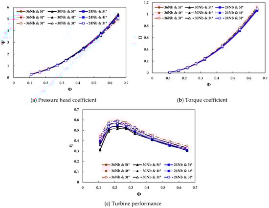Geometric optimization was conducted by the numerical simulations under constant-flow conditions to acquire higher turbine performance. The steady-flow analysis provided efficient simulation time in a wider range of operating conditions. The thickness of the rotor blades, t*, was optimized first from 3 to 5 mm at 350 rpm constant rotational speed with varying the number of blades as shown in Figure 5. The pressure difference across the turbine and torque of the turbine were represented as non-dimensional coefficients with respect to flow coefficient as shown in Figure 5a,b. As seen in Figure 5, both pressure and torque coefficients have a similar upward trend with an increase of the flow coefficient, and the gap was gradually increased in larger flow coefficients. Although there was less pneumatic power input for thinner thickness in larger flow rate, a higher power output of the turbine was acquired. Consequently, the highest performance was observed for 3 mm thickness and 36 blades in the entire operating range as shown in Figure 5c. For all blade numbers, thinner blades provided higher turbine performance. With this result, a 3 mm blade thickness was adopted for further optimization.