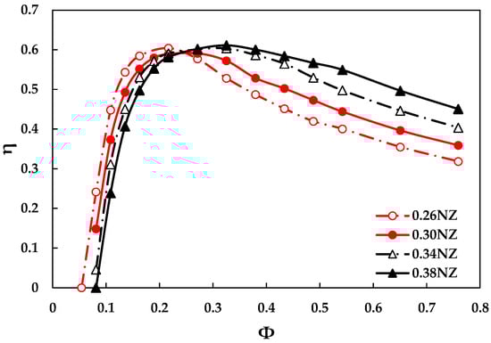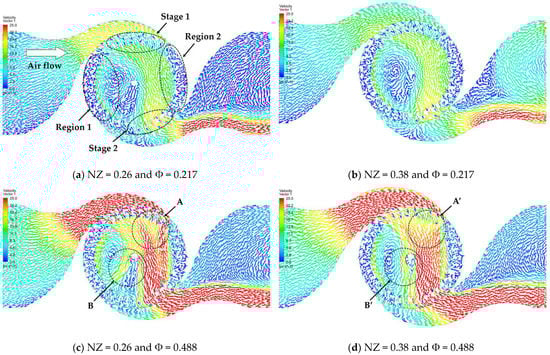 Four different nozzle throat configurations were simulated to analyze their effect on performance of the optimized rotor model (Nb = 36, t* = 3 mm, and = 700 rpm). As illustrated in Figure 7, the nozzle with the throat width of 0.38 reached the maximum performance of 0.611 after approximately 0.3 flow coefficient, and the curve was more flattened than the others with an increase in flow coefficient. The performance of nozzles having the narrow throat drastically decreased after their peak point. The flows in the turbine for NZ = 0.26 and 0.38 were represented with velocity vectors as illustrated in Figure 8. In the beginning, the incoming air flows from the left side passed stage 1 of the rotor as shown in Figure 8a. The air flowing out of stage 1 still possessed pneumatic energy, and the flows being decelerated were then accelerated again due to its converged passage, which is called cross-flow. The cross-flow significantly struck some blades in stage 2, and the flow velocity passing through the blades was higher than at stage 1. At Φ = 0.217, the turbine of NZ = 0.26 had higher efficiency since the higher velocities of the incoming flows at stage 1 and 2 were observed at NZ = 0.26. However, the cross-flow in the turbine of NZ = 0.26 at Φ = 0.488 had irregular velocity in region A as shown in Figure 8c, and then, it was dispersed as observed in region B. This flow behavior induced pneumatic energy loss, and thus the turbine efficiency was dramatically decreased for a wider flow coefficient. On the other hand, the cross-flow of NZ = 0.38 at Φ = 0.488 was more regular from stage 1 to stage 2 as shown in region A’, and there was less energy loss due to the spread of flows in region B’. The 0.38 throat width provided higher and wider turbine performance compared to that of other nozzle designs, and this nozzle design was selected for the final optimization model.